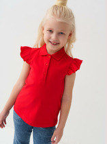 Детская футболка-поло для девочки. Модель из хлопкового трикотажа пике с короткими рукавами-крылышками. Поло прямого кроя, средней длины. Воротник и планка выполнены из рельефной трикотажной ткани. Застежка на три пуговицы.