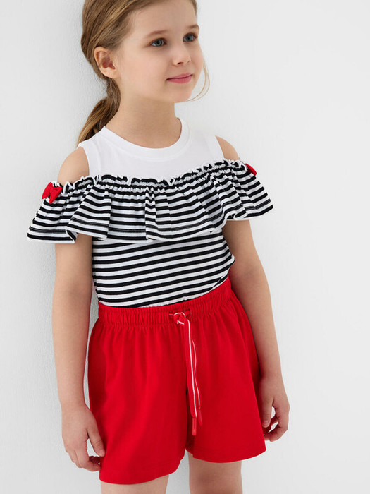 Детский костюм для девочки. Состоит из футболки с коротким рукавом и шорт. Выполнен из хлопкового трикотажа. Футболка прямого кроя, с рюшей и декоративными бантами. Шорты свободные, хорошо сидят на талии благодаря эластичному поясу и регулирующему шнурку.