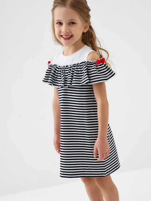 Детское платье для девочки. Платье средней длины, выполнено из мягкого хлопкового трикотажа джерси. Модель с открытыми плечами украшена широкой оборкой. В качестве милого акцента — два ярко-красных бантика на плечах. Платье имеет круглый вырез горловины и удобную свободную посадку.