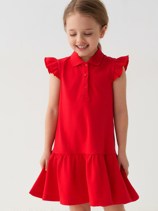 Летнее детское платье-поло для девочки. Выполнено из мягкого хлопкового трикотажа пике. Короткие рукава-крылышки, классический воротник поло и застежка на кнопки спереди. По низу — присборенная юбка, создающая нежный силуэт.
