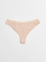 Трусы бикини женские из эластичного хлопкового полотна. По бокам вставки из кружева. Обработка краев по талии и ноге - ажурная резинка с фестоном, точечный зигзаг. По переду атласный бант.