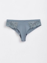 Бразилиана. Комбинированная модель с кружевной вставкой по верху переда и кружевной спинкой со средним швом. По поясу и ножке со стороны переда обработка резинкой с фестоном. На детали переда - небольшой атласный бант.