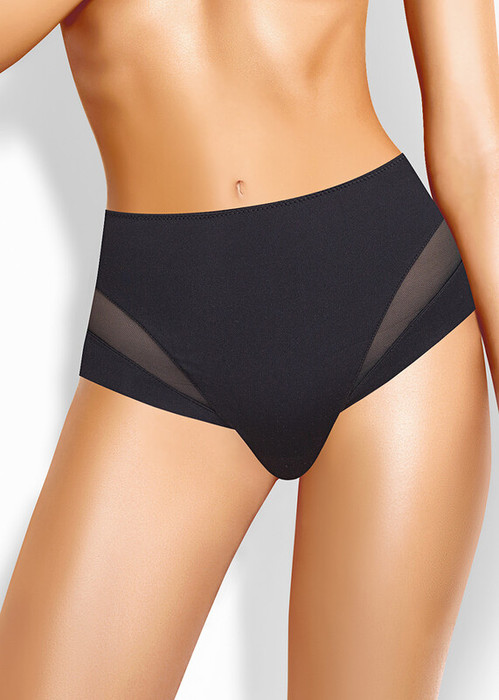 Трусы слипы с завышенной посадкой, сзади и по линии бикини бесшовная гладкая обработка, спереди декоративные диагональные вставки из плотной сетки, перед дублирован сеткой, по талии обработка с зигзагом и узкой резинкой
