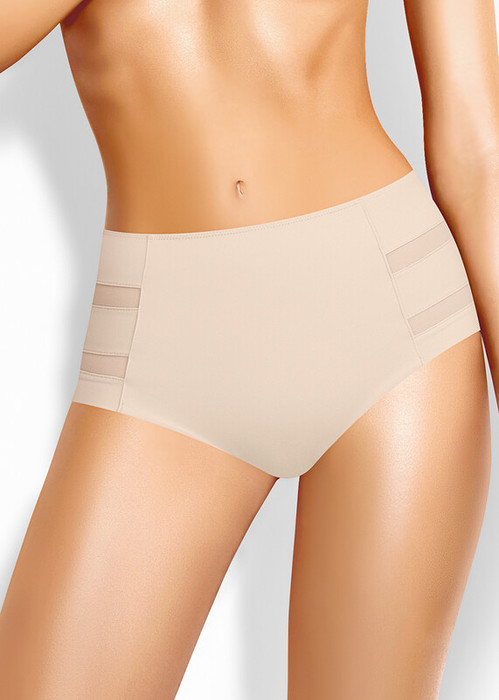 Трусы слипы с завышенной посадкой, сзади и сбоку бесшовная гладкая обработка, спереди декоративные горизонтальные вставки из плотной сетки, перед дублирован сеткой, по талии обработка с зигзагом и узкой резинкой.