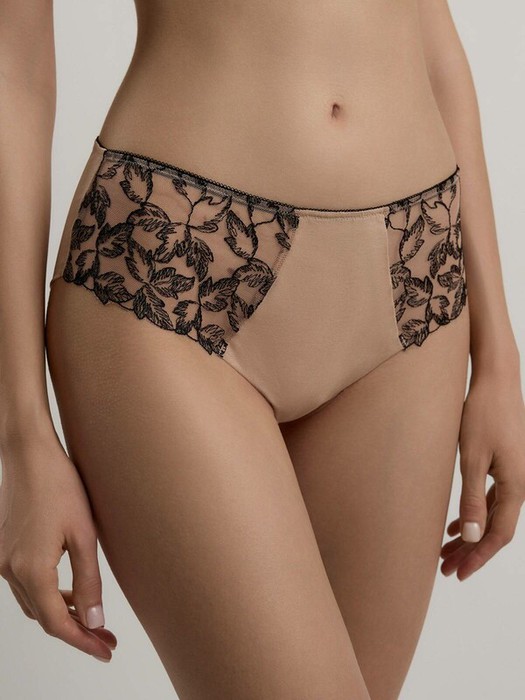Серия белья Nostalgie выполнена из мягкого сетчатого полотна в оттенке nude и эксклюзивной авторской вышивки, созданной дизайнерами Conte. Благодаря такому решению нежная сетка словно исчезает на теле, оставляя только воздушный рисунок черного цвета, который выглядит как эскиз изящной татуировки.