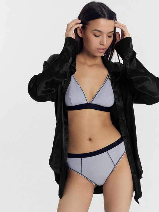 Бюстгальтер с мягкими треугольными чашками, без каркасов, выполнен из трикотажного полотна рибана. Чашка с вытачкой, на подкладке из трикотажного кулирного полотна. Верхний срез, срез проймы и верхний срез бочка окантованы бейкой из основного полотна с эластичной тесьмой внутри  с отделочной строчкой с верхним застилом.