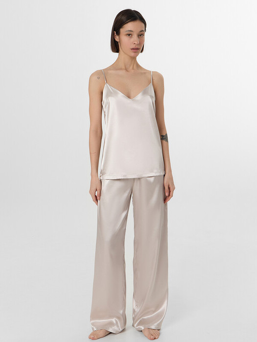 Комплект женский состоит из блузы и брюк. Блуза прямого силуэта удлиненная, на тонких бретелях. Горловина V-образной формы. Бретели выполнены из основного полотна с регулировкой на регуляторы и кольца (пластик 6мм). Горловина и проймы обработаны обтачкой. На передней детали застрочены вытачки. Нижний срез обработан швом вподгибку с закрытым срезом. Брюки прямые свободные, посадка средняя. Пояс цельнокроеный с эластичной тесьмой внутри (внутр. 20мм 20RV). Брюки с боковыми швами. Нижний срез обработан швом вподгибку с закрытым срезом.