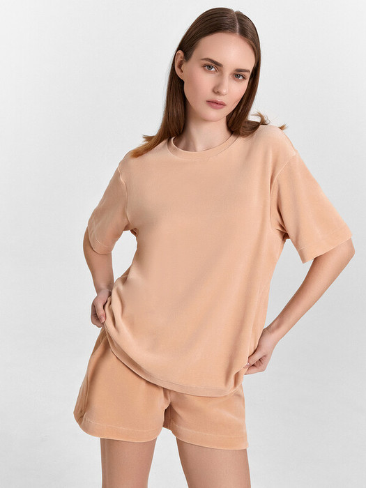 Комплект состоит из джемпера и шорт. Джемпер свободного силуэта. Горловина обработана обтачкой из основного полотна. Рукава втачные короткие, плечо спущено. Низ изделия и рукава обработан в подгибку. Шорты свободного силуэта, короткие. Пояс цельнокроеный, с втаченной эластичной тесьмой (вн. 30мм 30RV). Низ шорт обработан швом в подгибку.
