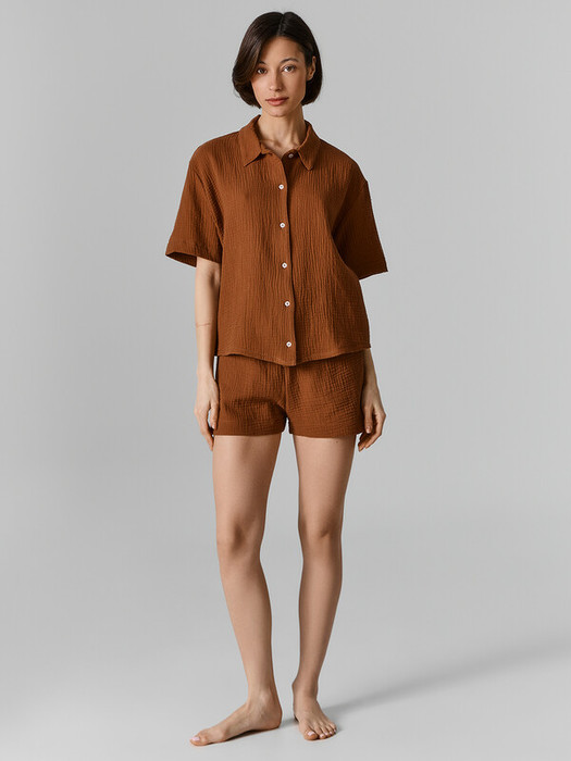 Шорты свободного силуэта, высокая посадка. Верх застрочен швом в подгибку с протянутым шнуром из основного полотна. В боковых швах карманы. Низ шорт обработан швом в подгибку.