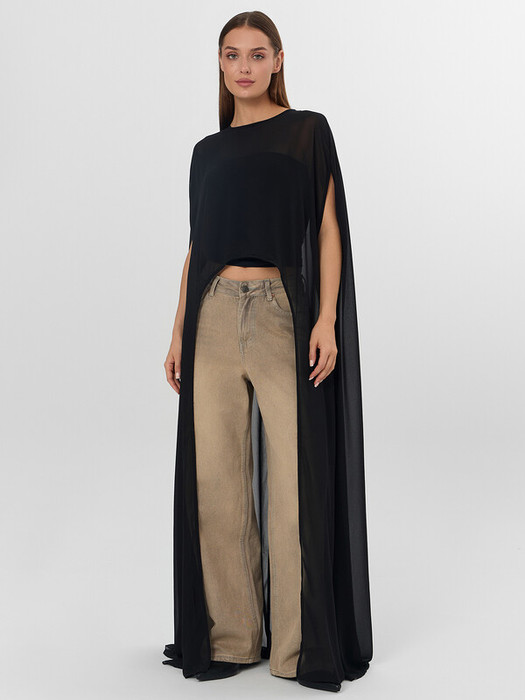 Туника А-силуэта. Горловина круглой формы. Окантована бейкой в чистый край, из основного полотна. Спинка со средним швом. В верхней части обработан разрез с застежкой на петлю и пуговицу (D10мм). В боковых швах обработаны разрезы для рук. Нижний срез фигурный. Спереди укороченный, сзади длиной в пол.