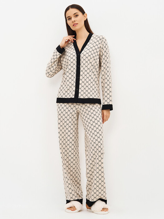 Трендовая пижама с актуальным принтом и контрастными акцентами создаёт стильный домашний образ и идеально подходит для сна и отдыха.