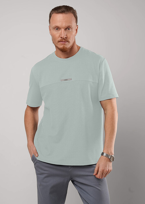 Футболка увеличенного обьема из комбинированной ткани: фактурное полотно и гладь. Интересное звучание модели придаёт дизайнерская нашивка спереди. Такая модель разнообразит любой образ и прекрасно подойдёт к спортивным брюкам или джинсам.