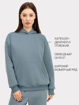 Анорак изготовлен из трикотажного полотна футер. Анорак свободного силуэта (оверсайз), с капюшоном. Горловина округлой формы. Капюшон со средним швом, на подкладке из осн. полотна. Плечо спущено, рукав втачной длинный. По низу рукава отрезная манжета из рибаны.