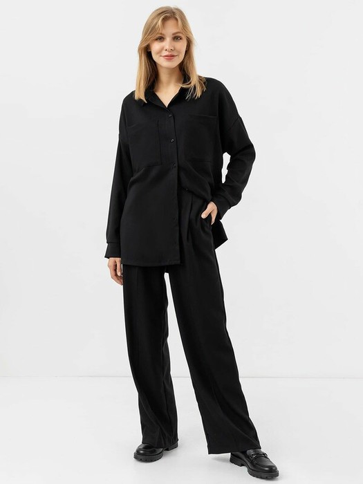 Ультрамодные женские брюки полной длины из ткани. Силуэт прямой, свободный. Пояс с эластичной тесьмой на задней части. На брюках заутюжены модные стрелки. Есть боковые карманы. Рекомендуем!