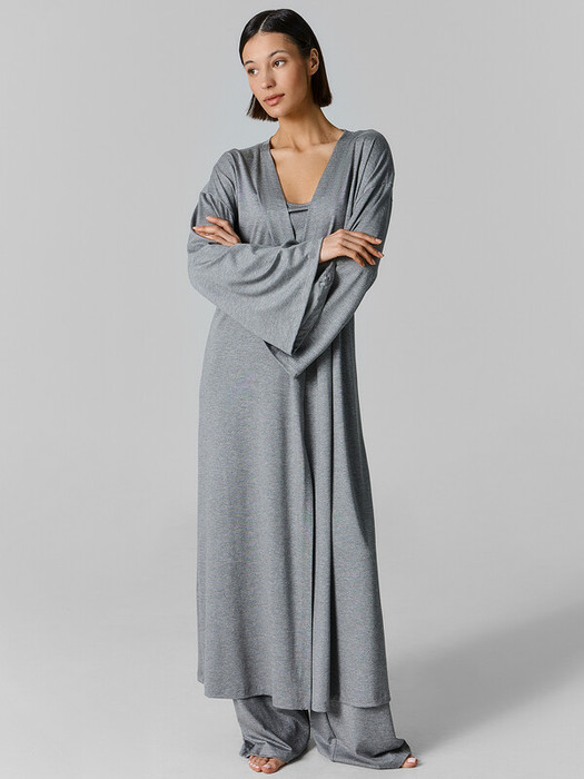Кардиган прямой свободный, длиной макси. Горловина V-образной формы. Горловина спинки обработана обтачкой из основного полотна. Борта обработаны швом вподгибку. Рукава втачные длинные, широкие.  Линия плеча спущена. Нижние срезы кардигана и рукавов обработаны швом вподгибку.