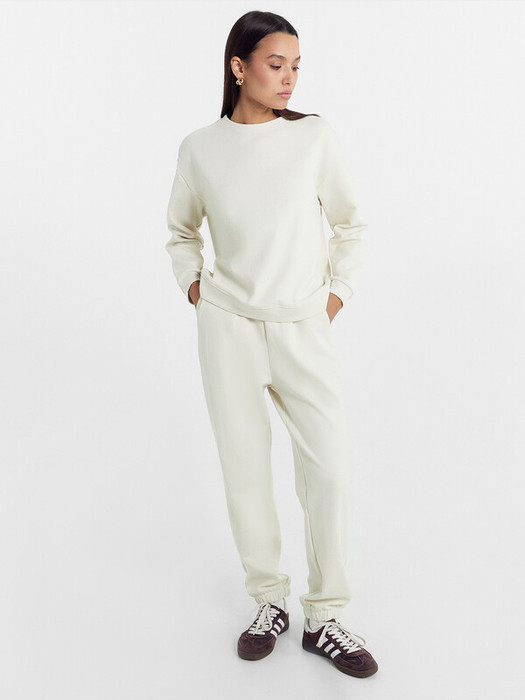 Горловина круглой формы. Плечо спущено, пройма углублена. Рукав втачной длинный, по низу рукава отрезная манжета. Пояс отрезной. Брюки-джоггеры из основного полотна с эластичной тесьмой внутри. По поясу проложены отделочные строчки. В боковых швах выполнены карманы с отрезным бочком. Легкий и невероятно комфортный комплект женский на каждый день. Широкий размерный ряд. Базовые актуальные цвета в коллекции. Рекомендуем для создания комфртных образов весной, летом и в демисезон!