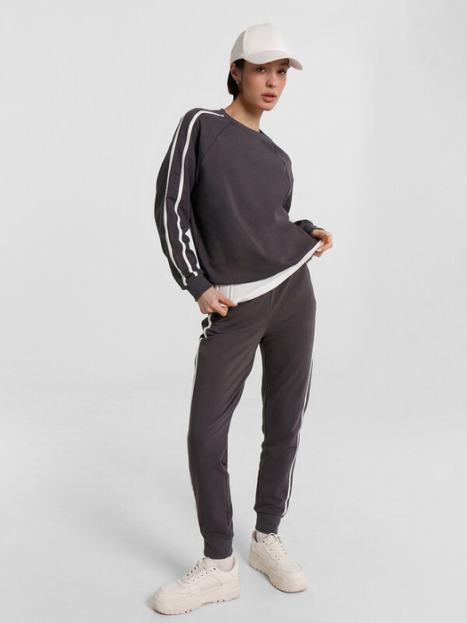 Спортивный комплект из футера без подчеса. В составе полотна – натуральный хлопок, немного полиэстера для прочности и эластана, который дарит свободу движений при нагрузках. Джемпер прямого силуэта, с длинными рукавами на манжетах, эластичным поясом на нижнем срезе и лампасами. Брюки зауженного к низу силуэта, на манжетаха, с лампасами и боковыми карманами. Широкий пояс из рибаны со шнурком-завязкой дарит особый комфорт во время занятий спортом и отдыха.