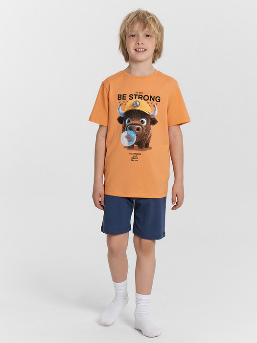 Пижама для мальчиков. Выполнена из хлопкового трикотажа кулирного переплетения. Комплект включает футболку и шорты. Футболка свободная, с круглой горловиной и короткими рукавами. Шорты длиной до колен, с эластичной тесьмой в поясе. Отличный комплект для сна и отдыха!