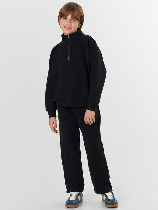 Черный спортивный костюм для мальчиков — это комфорт и практичность для активного образа жизни. Набор из свитшота и брюк-джоггеров выполнен из  хлопка, который обеспечивает мягкость, воздухообмен и безопасность для детской кожи.