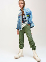 Брюки для девочки подростка. Модель из легкого, хлопкового текстиля. Свободный, прямой крой со средней посадкой. Пояс на резинке дополнен шнуром для регулировки. Спереди и сзади — удобные карманы. Украшены небольшим резиновым лейблом.