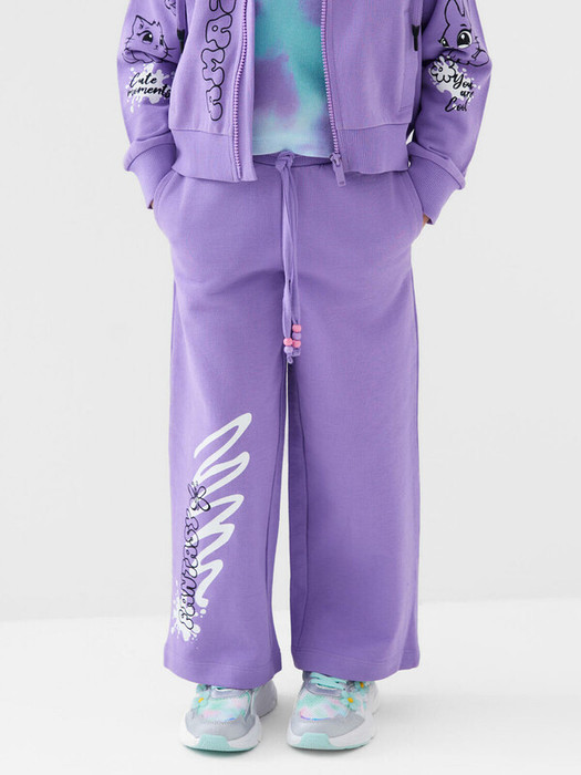 Спортивные широкие детские брюки для девочки. Выполнены из мягкого хлопкового трикотажа футер без начеса. Пояс на резинке, для регулировки талии предусмотрен шнур. По бокам расположены карманы. Декоративные принты и бусины на шнуре для регулировки посадки.