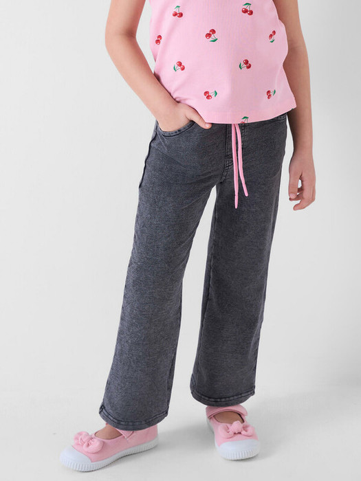 Детские брюки для девочки. Модель клеш, выполнена из мягкого хлопкового трикотажа с эффектом денима. У брюк высокий комфортный пояс на резинке и шнурок для регулировки. Спереди — два удобных кармана.