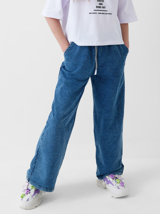 Широкие брюки для девочки подростка. Модель палаццо, выполнена из мягкого хлопкового трикотажа с эффектом денима. У брюк высокий комфортный пояс на резинке и шнурок для регулировки. Спереди — два удобных кармана.
