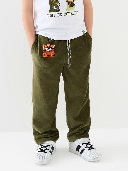 Детские брюки для мальчика. Выполнены из хлопкового вельветового трикотажа. Пояс на резинке со шнуром для регулировки. По бокам — два кармана. На правой брючине спереди — небольшая светящаяся нашивка, а на поясе — петелька с мягким съемным брелоком тигра.