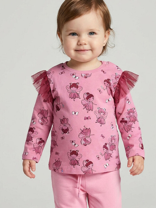 Лонгслив детский для девочки. Выполнен из мягкого хлопкового трикотажа джерси с ярким принтом, на котором изображены феи и цветы. Круглая горловина и застёжка на кнопках на плече — для удобства переодевания. Декор из сетки на плечах.