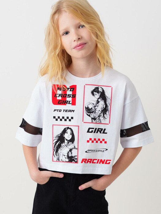 Футболка оверсайз для девочки подростка. Модель укороченная, выполнена из эластичного хлопкового трикотажа джерси. Красочный принт в гоночной тематике. Горловина круглая. На рукавах вставки из сетки.