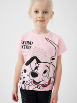 Детская футболка для девочки. Модель свободного кроя, выполнена из эластичного хлопкового трикотажа джерси. Спереди расположен крупный принт с героем из любимого мультфильма "101 далматинец". Сзади - декоративная нашивка. Горловина круглая. По низу эластичная тесьма.