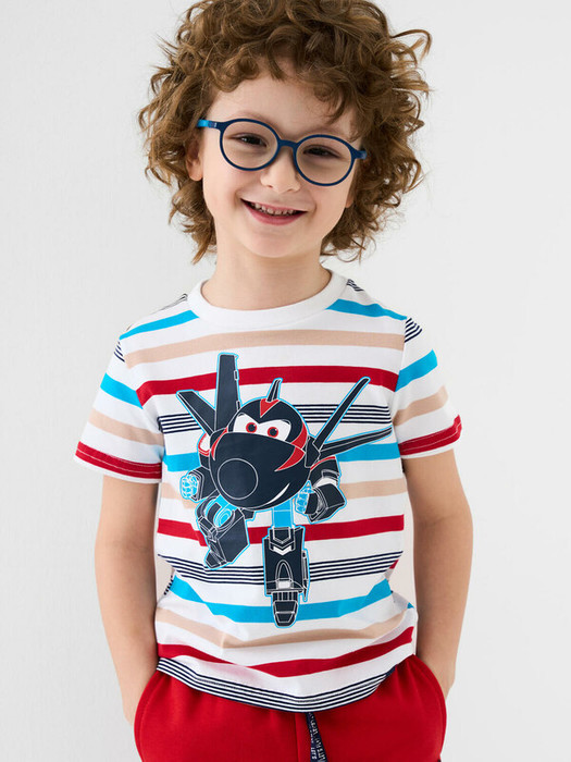 Детская футболка для мальчика. Модель прямого кроя, выполнена из эластичного хлопкового трикотажа джерси. Яркий принт с мультяшным героем "Super Wings". Горловина круглая, обработана эластичным рибом. В нижней части — небольшая нашивка.