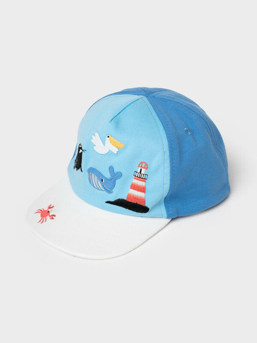 Детская бейсболка для мальчика. Выполнена из хлопкового трикотажа. На передней части расположены красочные вышивки: морской котик, кит, чайка и маяк, а на козырьке — забавный краб. Сзади вшита мягкая резинка, которая помогает кепке лучше сидеть на голове. По бокам — маленькие вентиляционные отверстия.