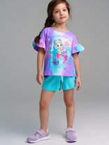 Легкий детский комплект для девочки. Выполнен из мягкого хлопкового трикотажа джерси, состоящий из футболки и юбки-шорт. Футболка прямого кроя с нежным принтом и декором из сетки. На плече застежка на кнопки для удобного переодевания. Рукава-крылышки. Пышная юбка на резинке с воланами, внутри имеет удобные шорты, что делает модель практичной для активного отдыха.