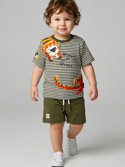 Детский костюм для мальчика. Состоит из футболки и шорт. Выполнен из хлопкового трикотажа. Футболка прямого кроя, с коротким рукавом. На плече застежка на кнопки для удобного переодевания. Яркий принт и нашивки. Шорты свободные, с эластичным поясом и шнурком для регулировки посадки. По бокам расположены карманы.
