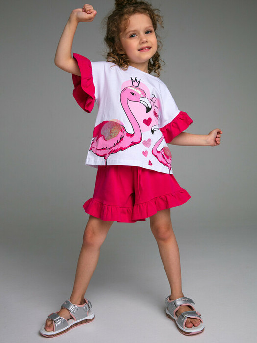 Комплект: футболка и шорты из качественного эластичного и приятного на ощупь трикотажа;. Декор реверсивными пайетками и рюшами по рукавам и низу шорт. Шорты с эластичной резинкой по талии и шнурком. Высокое содержание хлопка 95%. Благодаря наличию эластана в составе ткани изделие держит форму и меньше мнется.