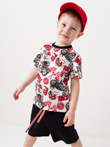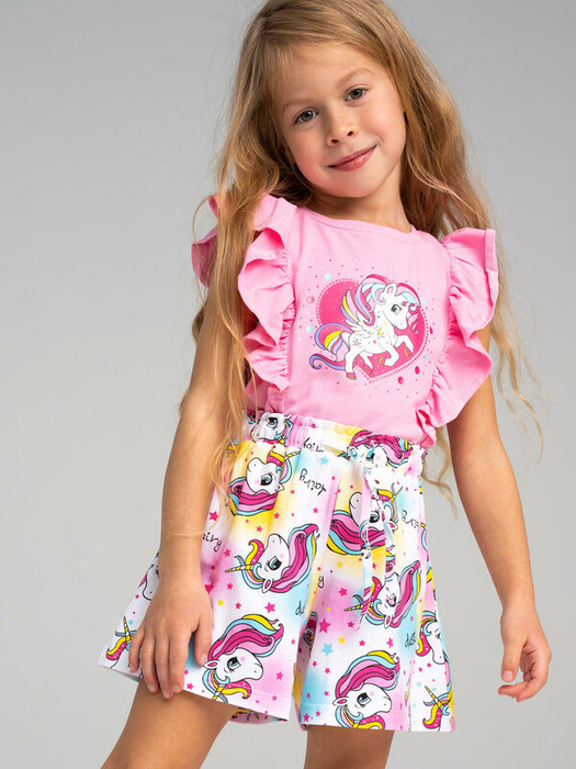 Комплект: футболка и шорты из качественного эластичного и приятного на ощупь трикотажа. Футболка декорирована рюшами по рукавам. Шорты с эластичной резинкой по талии и шнурком. Высокое содержание хлопка 95%. Благодаря наличию эластана в составе ткани изделие держит форму и меньше мнется.