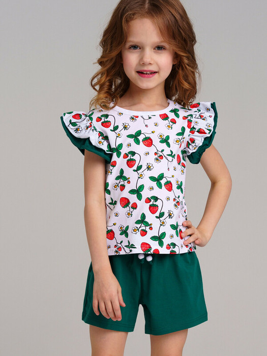 Комплект: футболка, шорты из качественного и приятного на ощупь трикотажа джерси. Высокое содержание хлопка 95%. Благодаря наличию эластана в составе ткани изделие проще в уходе и держит форму. Эластичный пояс со шнурком. Оптимальная посадка: шорты не сползают при движении.