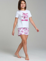 Пижама: футболка, шорты с высоким содержанием хлопка. Благодаря наличию эластана в составе ткани, изделие проще в уходе и держит форму. Шорты свободного кроя. Эластичный пояс с тесьмой позволяет легко надевать шорты и утягивать до комфортной посадки.
