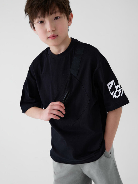 Костюм для мальчика подростка. Состоит из футболки и шорт. Выполнен из хлопкового трикотажа. Футболка оверсайз, с коротким рукавом. Декоративный накладной карман на груди с молнией. Яркий графичный принт на рукаве. Шорты свободные, с эластичным поясом и шнурком для регулировки посадки. По бокам расположены карманы. Декоративная нашивка.