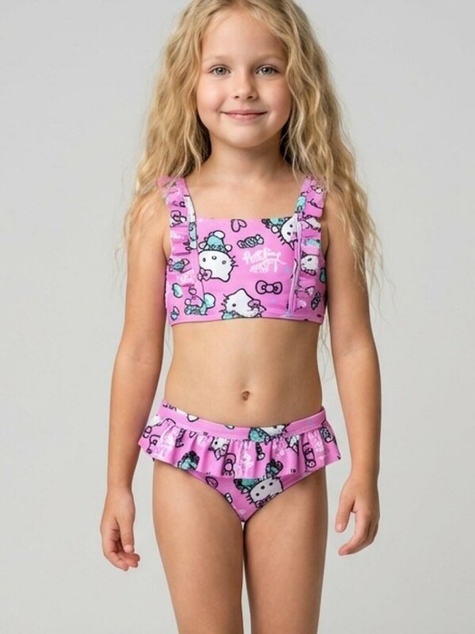 Купальник детский раздельный для девочки. Модель с принтом Hello Kitty с конфетами и бантиками. Топ с прямым вырезом и декоративными воланами на лямках, которые регулируются по длине. Плавки украшены воланом по поясу. Внутри предусмотрена подкладка, а по краям изделия использованы эластичные резинки для удобной посадки. Благодаря UF-защите, ткань сохраняет первоначальный вид даже при длительном пребывании на солнце. Подходит для плавания и активного отдыха.