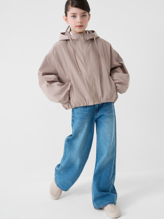 Ветровка оверсайз для девочки подростка. Температурный режим от +20С до +10С. Ткань с ветрозащитным и водоотталкивающим покрытием. Внутри гладкая подкладка. Капюшон несъемный, регулируется шнуром. Спереди расположены два кармана на молнии. По низу и на манжетах — мягкие резинки для комфортной посадки. Сзади и на рукаве есть светоотражающие ярлычки для безопасности в темное время суток.