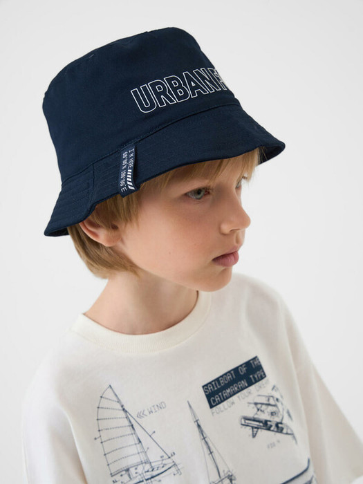 Панама для мальчика подростка. Модель из плотной хлопковой ткани, с декоративной надписью. Имеет классическую форму с удобной посадкой. По бокам расположены вентиляционные люверсы, сзади — небольшая тканевая петля с логотипом. Поля аккуратно отстрочены. Внутри — мягкая подкладка.