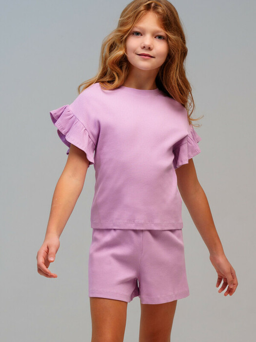 Пижама для девочки подростка. Футболка и шорты из эластичного и приятного на ощупь трикотажа. Шорты на резинке. Высокое содержание хлопка 95%. Благодаря наличию эластана в составе ткани изделие держит форму и меньше мнется.