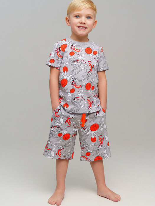 Пижама детская для мальчика. Футболка и шорты из эластичного и приятного на ощупь трикотажа. Шорты на резинке со шнурком. Высокое содержание хлопка 95%. Благодаря наличию эластана в составе ткани изделие держит форму и меньше мнется.
