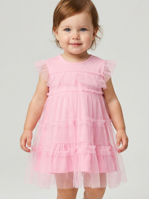 Легкое детское платье для девочки. Выполнено из розовой сетки с подкладкой. Верх — из мягкого трикотажа хлопкового трикотажа джерси, а юбка состоит из ярусов с пышными рюшами. Короткие рукава-крылышки украшены рюшами. Застёжка сзади — на пуговицу и эластичную петлю.
