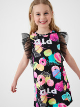 Яркое детское платье для девочки. Выполнено из мягкого хлопкового трикотажа джерси с оригинальным многоцветным принтом. Дизайн украшен изображениями пирожных, пончиков и ярких сладостей. По рукавам — декоративные крылышки из лёгкой двухслойной сетки, которые придают образу воздушность. Круглый вырез горловины с аккуратной отделкой. Платье прямого силуэта и укороченной длины — чуть выше колена.