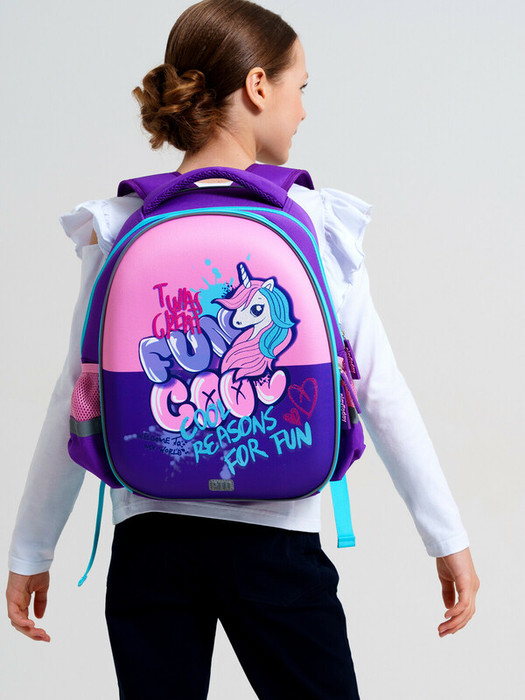 Школьный рюкзак для девочки подростка. Формованный ранец с ортопедической вентилируемой спинкой, распределяющей равномерно нагрузку на спину ребенка. Широкие вентилируемые лямки, регулируемые под рост и одежду ребенка, ранец отлично держит форму, не деформируется при складывании в него школьных принадлежностей, устойчивое дно с пластиковой накладкой. Влагозащитная пропитка, светоотражающие элементы на лямках, карманах и передней понели, а так же по периметру задней и передней панелях. Основное отделение на молнии, дополнительный отсек на молнии, два боковых кармана, внешний карман на молнии. В основном отделении большой внутренний карман с тремя отсеками для папок и тетрадей с эластичной лентой липучка, в дополнительном отсеке карманы и отсеки для канцелярских принадлежностей. Рюкзак в школу можно дополнить мешком для обуви и пеналом в том же дизайне.