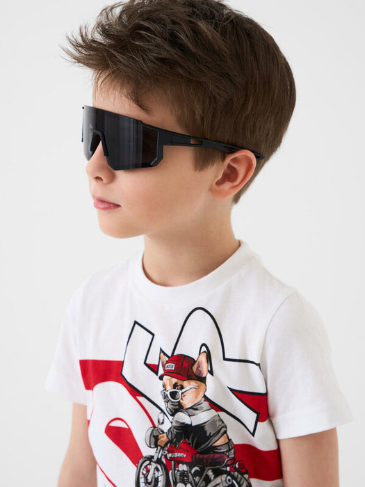 Солнцезащитные очки футуристической формы в стиле Y3K для мальчика подростка. Гибкая пластиковая конструкция мягко облегает лицо, не сдавливая его, а регулируемые подушечки для носа и кончики виска обеспечивают плотную посадку даже во время самых активных занятий ребенка. Солнцезащитные очки с фильтром Cat3.  Темные линзы имеют защиту UV400, которая отражает 100% ультрафиолетовых лучей с длиной волны менее 400 нанометров, эффективно блокируя все ультрафиолетовые лучи при солнечном свете. Небьющиеся акриловые линзы на 100% блокируют вредные UVA/UVB лучи. Ширина оправы - 125 мм, длина дужки - 113 мм. Обхват головы 50-52 см. Такие очки эффективны для защиты глаз в тропиках, у моря и в горах. Очки транспортируются в картонной коробке. В комплект входит фирменный текстильный чехол из микрофибры, с помощью которого легко ухаживать за изделием. Очки транспортируются в картонной коробке.