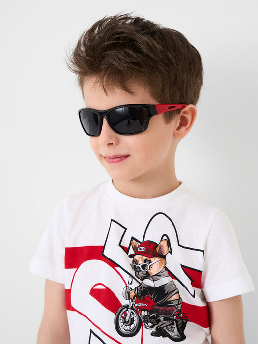 Солнцезащитные очки с эффектными красными дужками в стиле Y3K для мальчика подростка. Гибкая пластиковая конструкция мягко облегает лицо, не сдавливая его, и обеспечивают плотную посадку даже во время самых активных занятий ребенка. Солнцезащитные очки с фильтром Cat3.  Темные линзы имеют защиту UV400, которая отражает 100% ультрафиолетовых лучей с длиной волны менее 400 нанометров, эффективно блокируя все ультрафиолетовые лучи при солнечном свете. Небьющиеся поликарбонатные линзы на 100% блокируют вредные UVA/UVB лучи. Ширина оправы - 135 мм, длина дужки - 120 мм. Обхват головы 50-52 см. Такие очки эффективны для защиты глаз в тропиках, у моря и в горах. Очки транспортируются в картонной коробке. В комплект входит фирменный текстильный чехол из микрофибры, с помощью которого легко ухаживать за изделием. Очки транспортируются в картонной коробке.